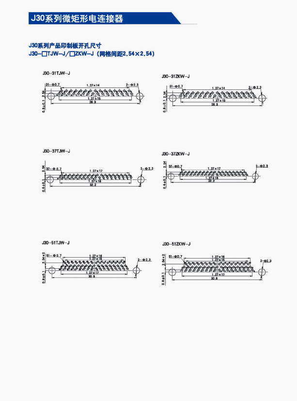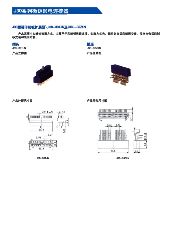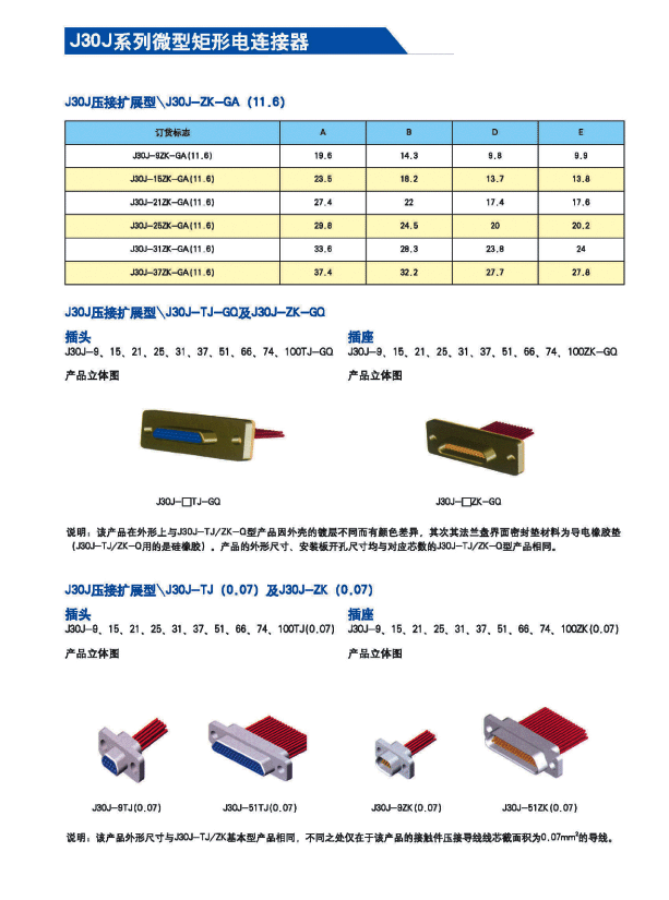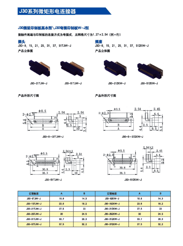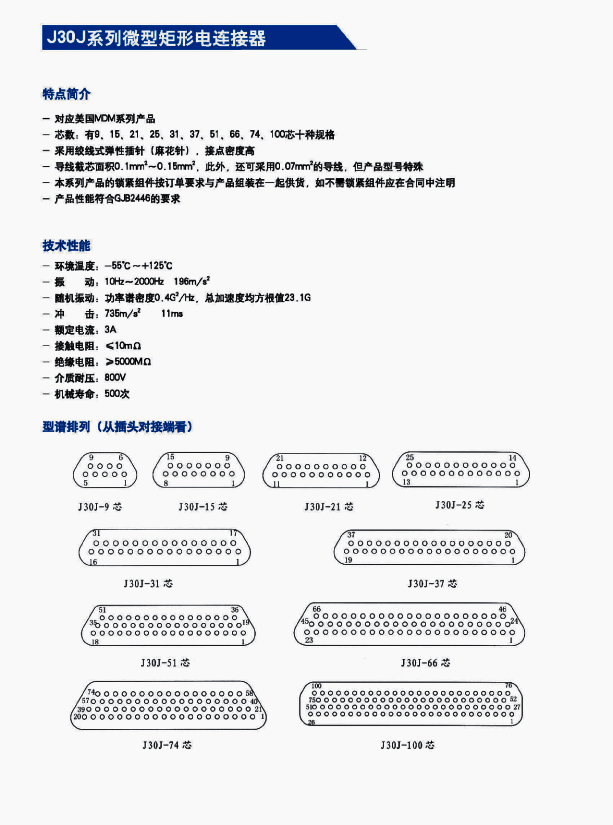 J30矩形航空插頭符合CJB2446;間距1.27mm;產品采用塑料外殼接插件;包括9芯-74芯等多種規(guī)格;有適用于印制板的尾端變更。