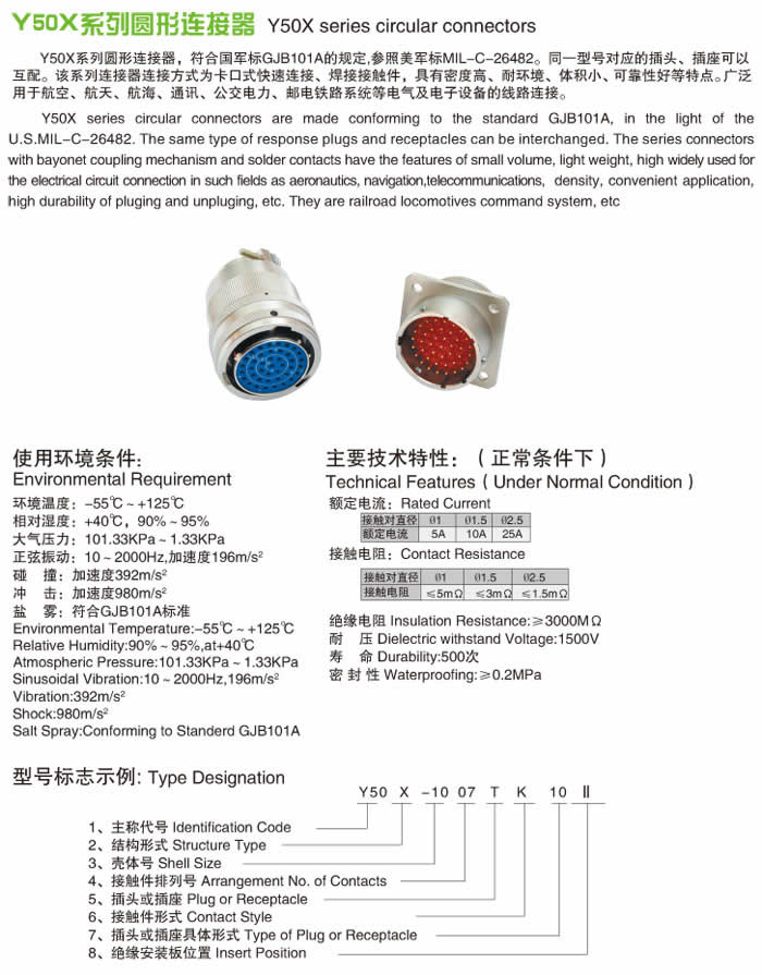 Y50A系列圓形印制板電連接器,插座端接方式采用印制板焊接式。同等芯譜連接器可以互插。