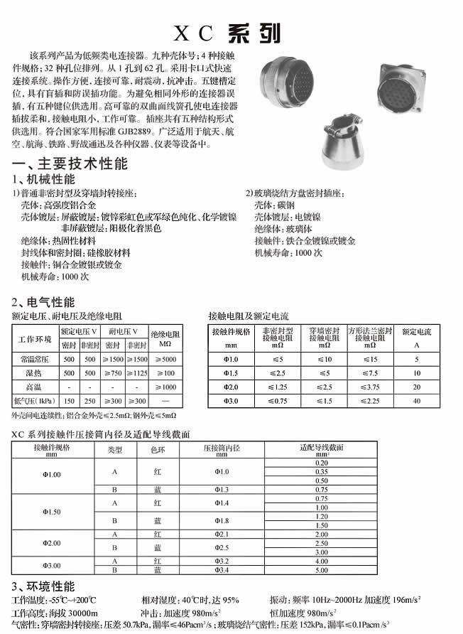 XC圓形線簧孔信號(hào)電連接器,結(jié)構(gòu)特點(diǎn)目前主要分三大類:1.環(huán)境性能。2.電氣性能。3.機(jī)械性能。該產(chǎn)品技術(shù)參數(shù)多,航空插頭用在那個(gè)配套項(xiàng)目,所要求技術(shù)也不絕對(duì)一樣,可根據(jù)情況而變,具體有空請(qǐng)聯(lián)系:0523-87596310