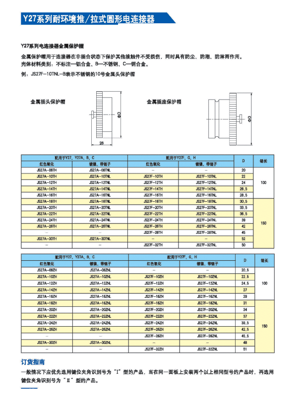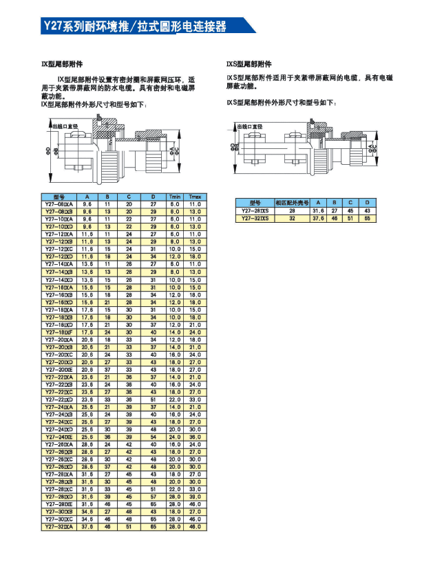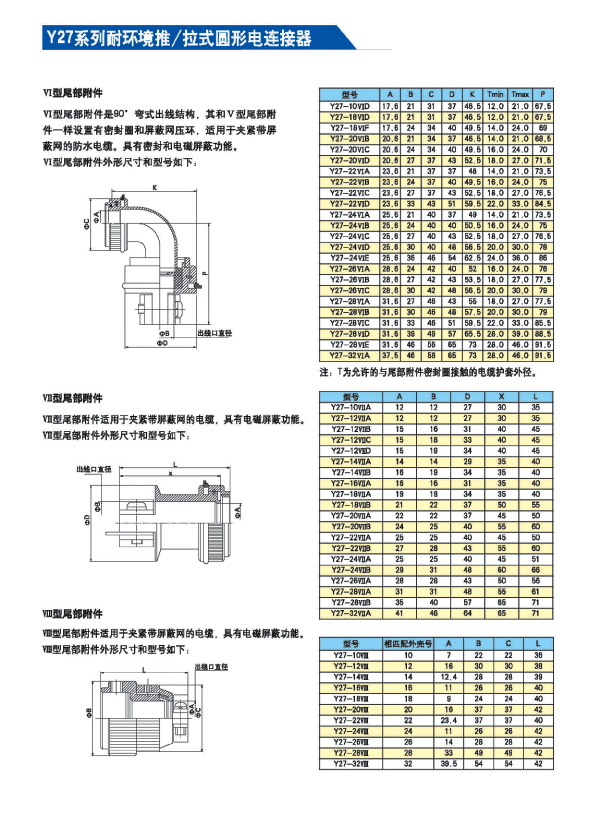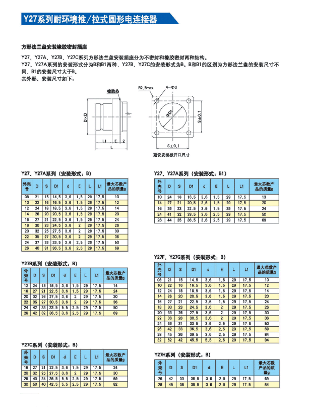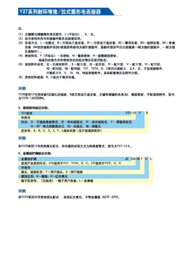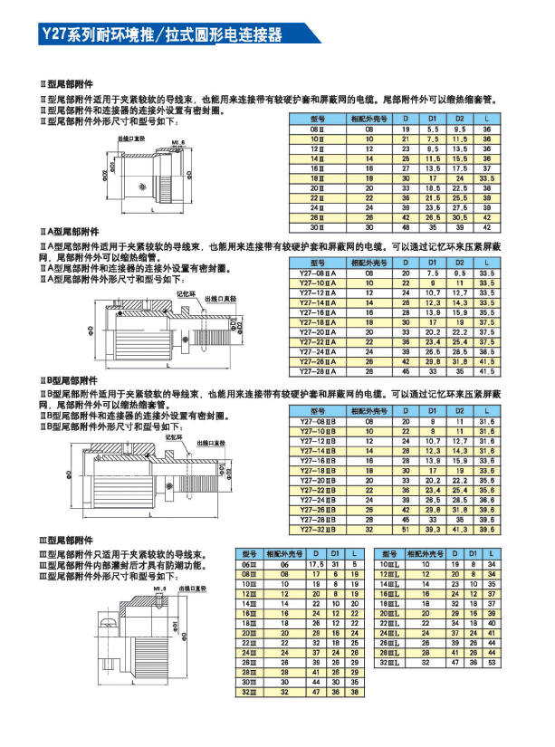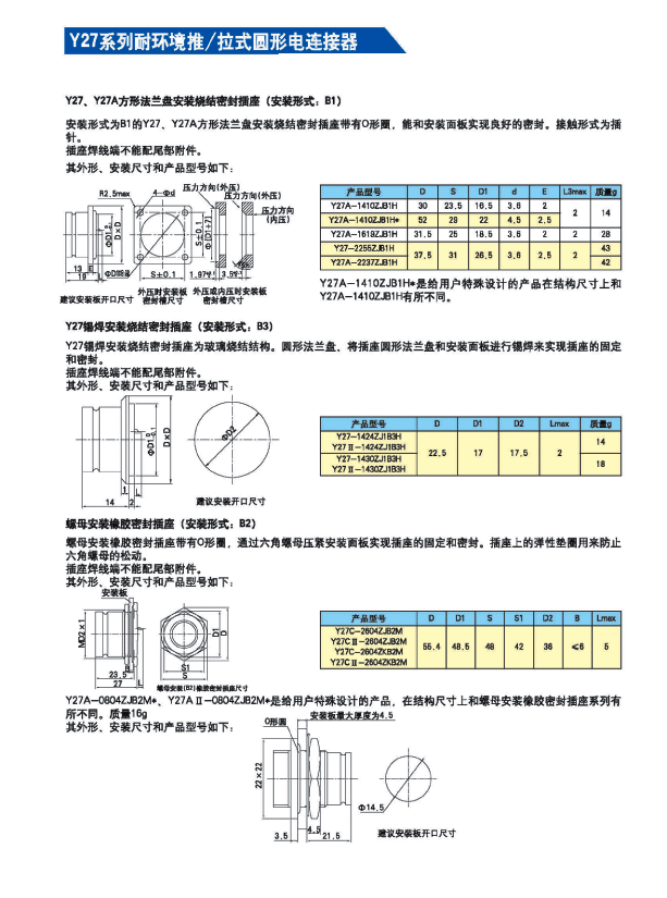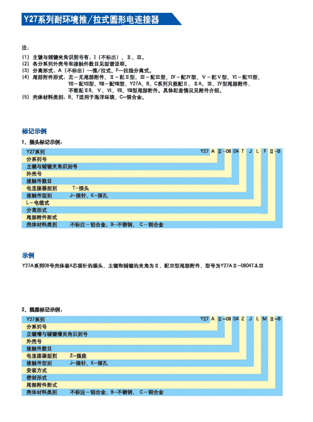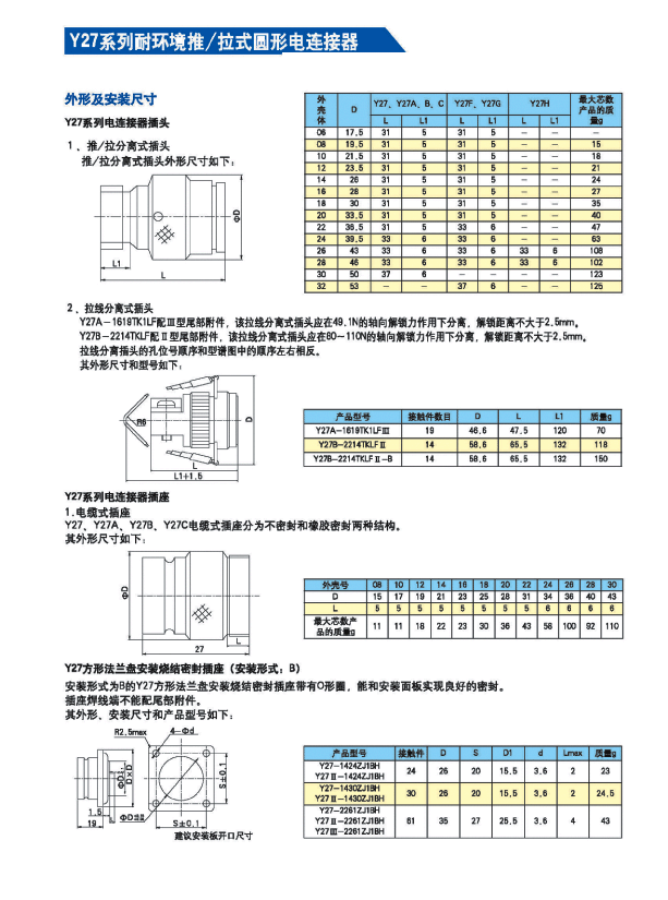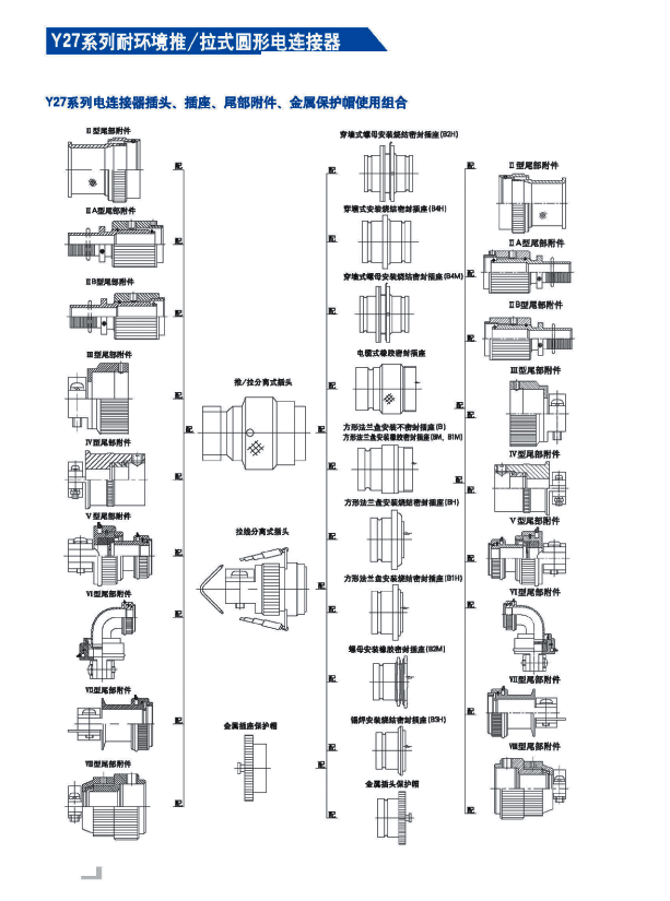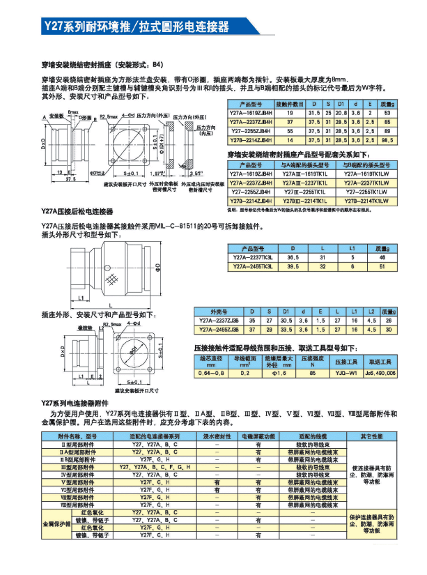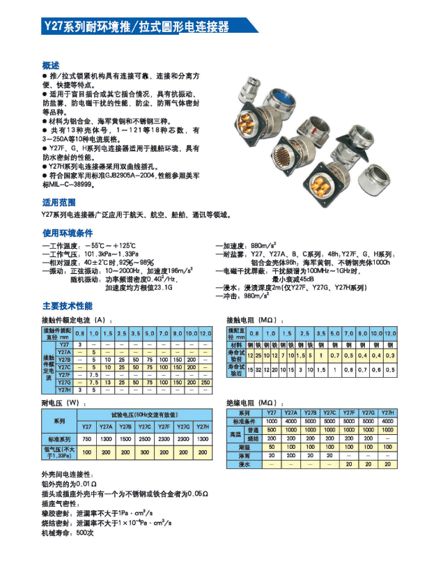 Y27系列耐環(huán)境推/拉式圓形電連接器 ,采用推/拉式鎖緊機(jī)構(gòu),材料為鋁合金、海軍黃銅和不銹鋼三種,共有13種殼體號(hào),1~121等18種芯數(shù),有3~250A等10種電流規(guī)格。Y27A系列電連接器有壓接后松的品種。Y27F、G、H系列電連接器適用于艦船環(huán)境,具有防水密封的性能。Y27H系列電連接器采用雙曲線插孔。符合國(guó)家軍用標(biāo)準(zhǔn)GJB2905-97,性能參照美軍標(biāo)MIL-C-38999。 該系列航空電連接器連接和分離方便、快捷,適用于盲目插合或其他插合情況,具有抗振動(dòng)、防鹽霧、防電磁干擾的性能,有防塵、防雨及氣體密封等品種。Y27系列電連接器廣泛應(yīng)用于航天、航空、船舶、通訊等領(lǐng)域。