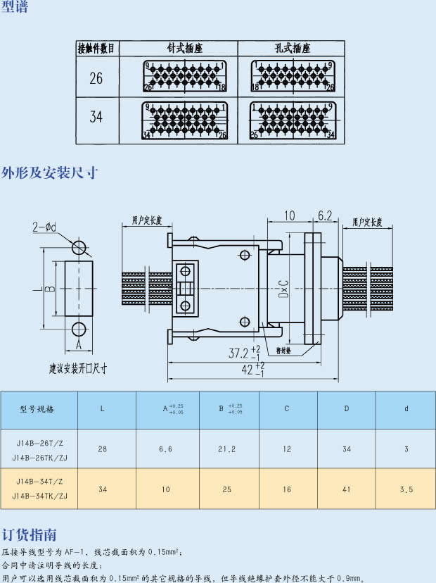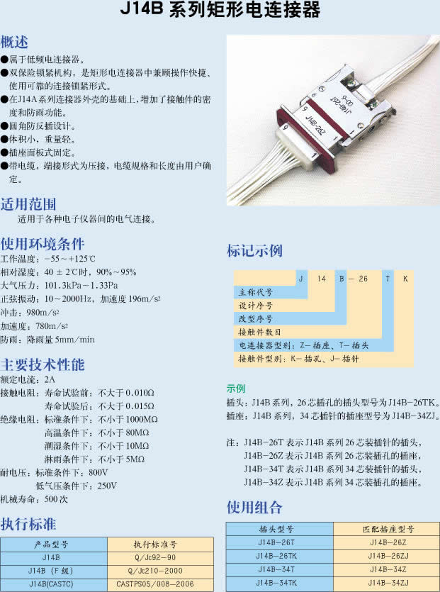 J14B-26ZJ/TK矩形航空插頭,在J14A系列連接器外殼的基礎(chǔ)上,增加了接觸件的密度和防雨功能。帶電纜,端接形式為壓接,電纜規(guī)格和長度由用戶確定。