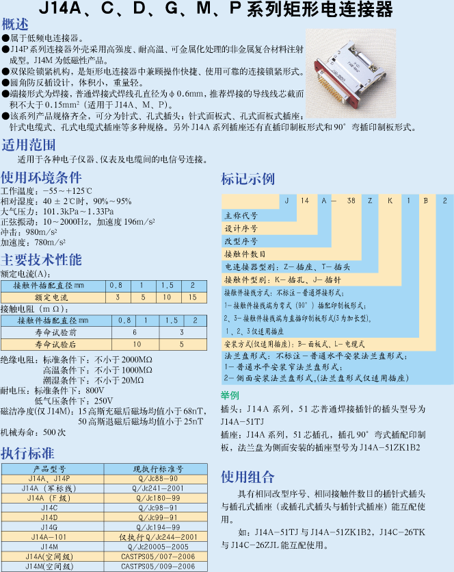 J14A屏蔽式矩形電連接器,為金屆框架式連接器,主要用于電子組合機(jī)柜和機(jī)箱、船段與能段之間的電連接,內(nèi)部裝有濾波元件,具有良好的電磁屏蔽性能。